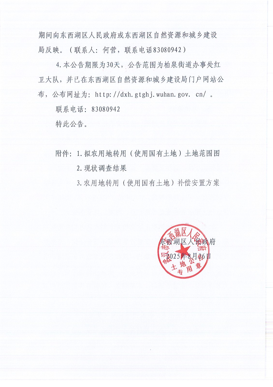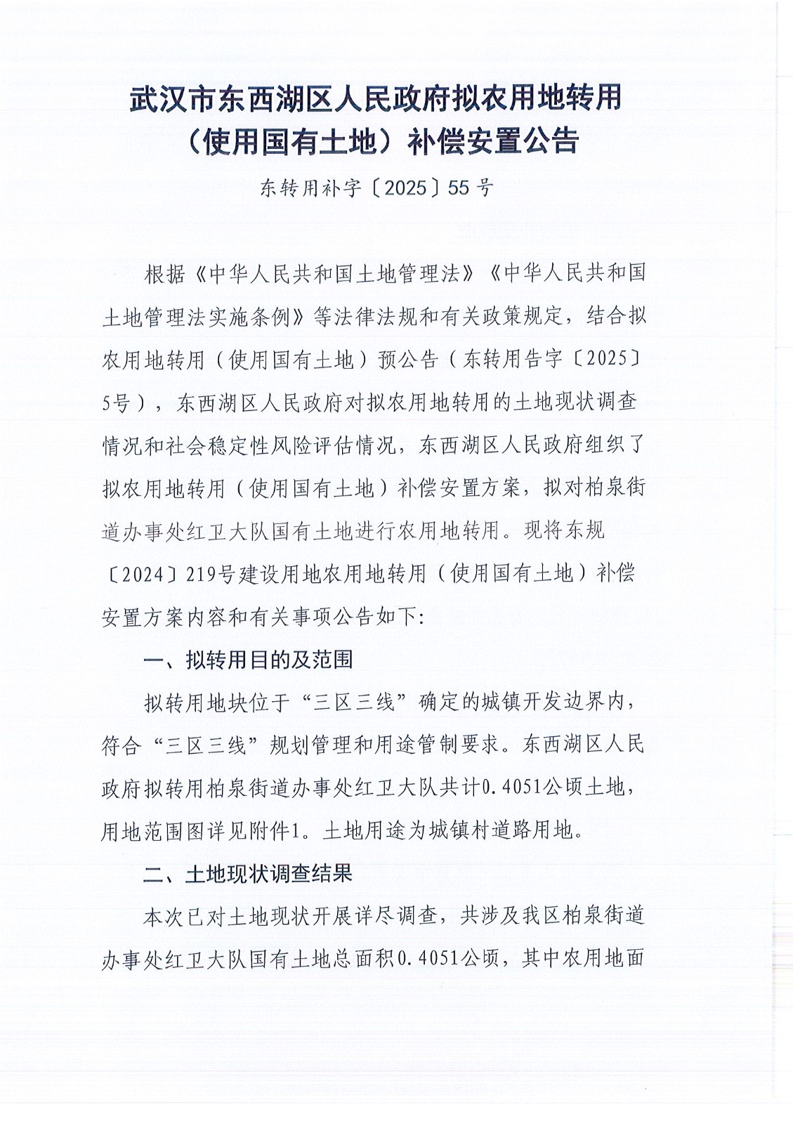 武汉市东西湖区人民政府拟农用地转用(使用国有土地)补偿安置公告(东转用补字〔2025〕55号)