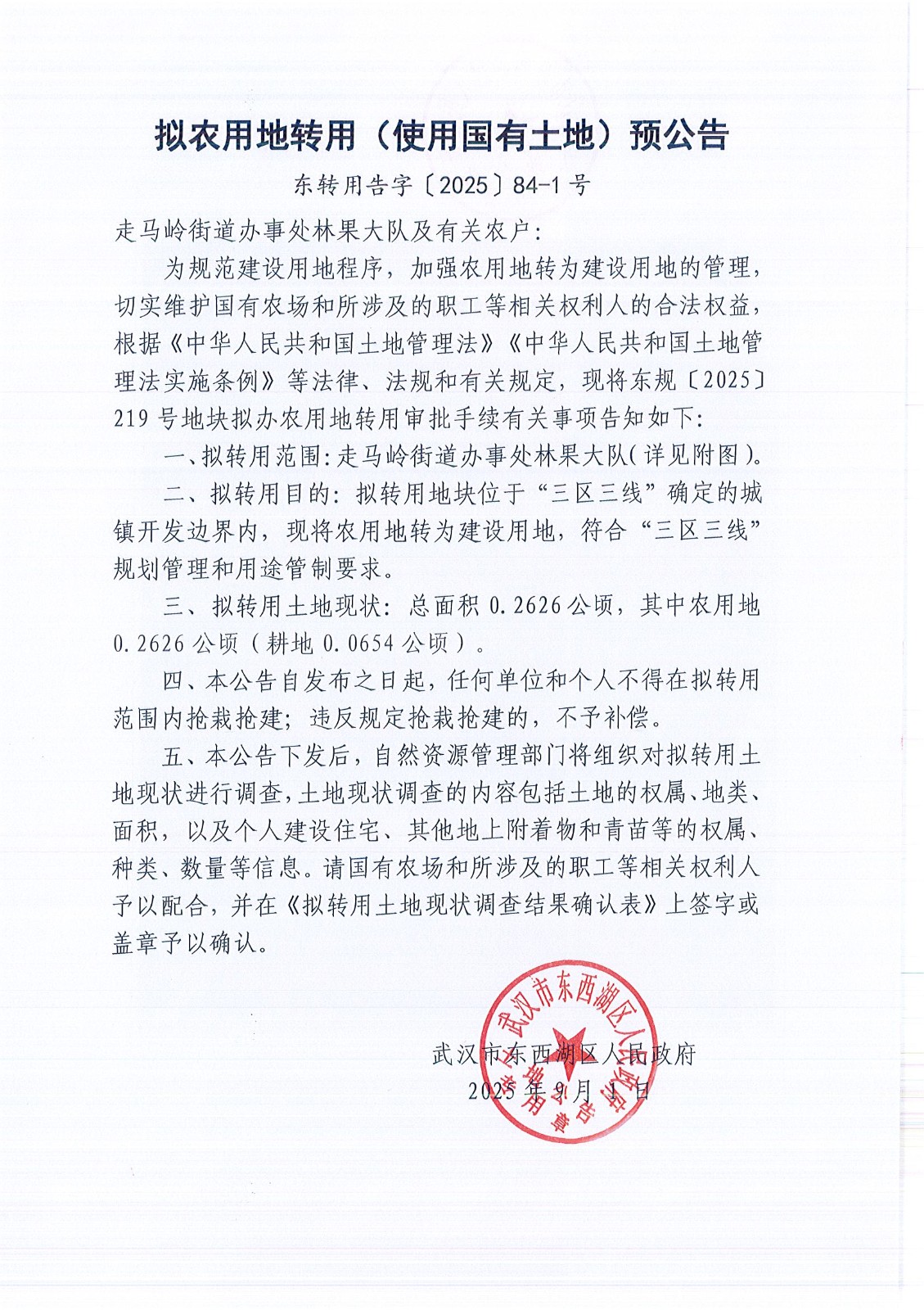 拟农用地转用(使用国有土地)预公告(东转用告字〔2025〕84-1号)