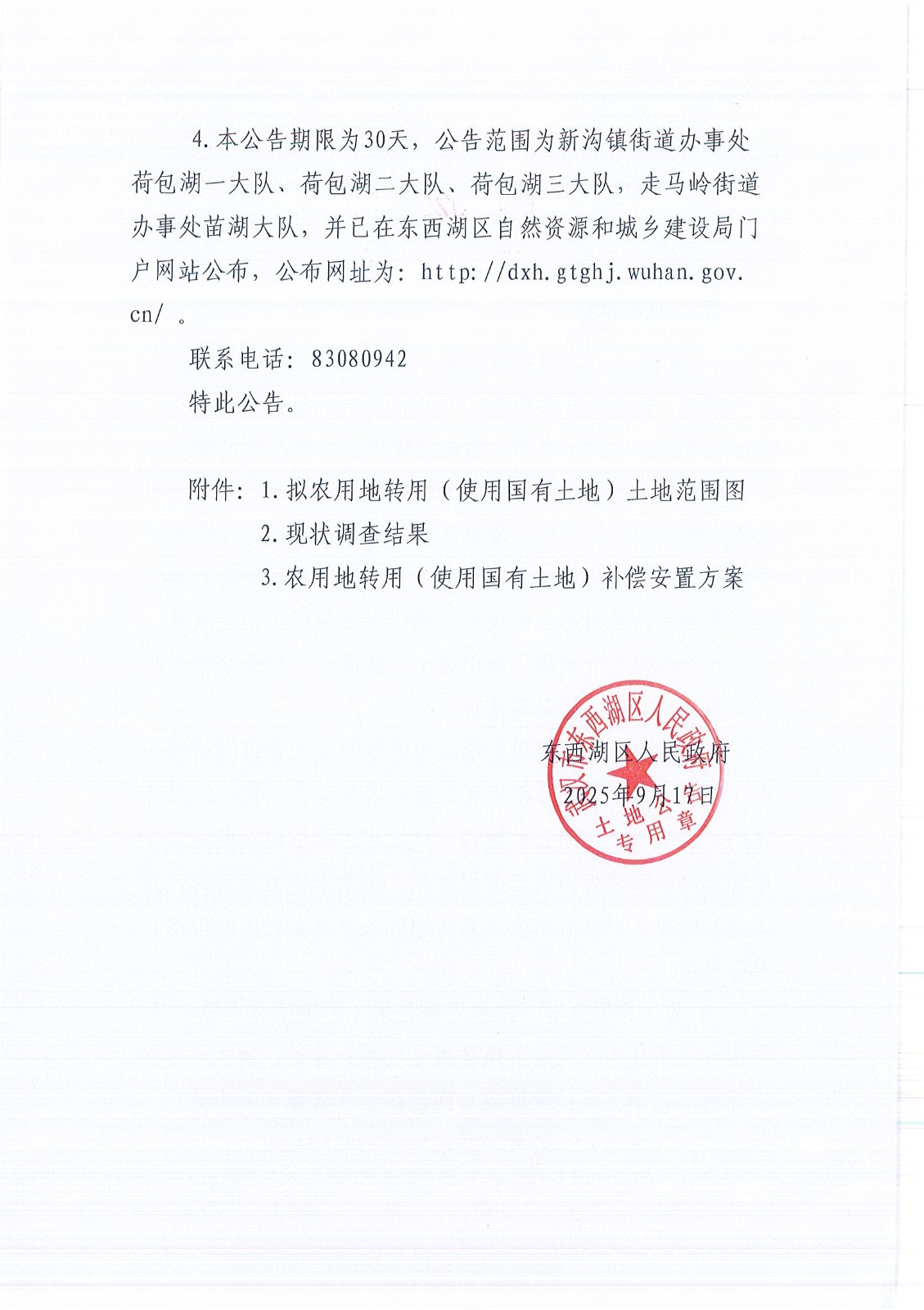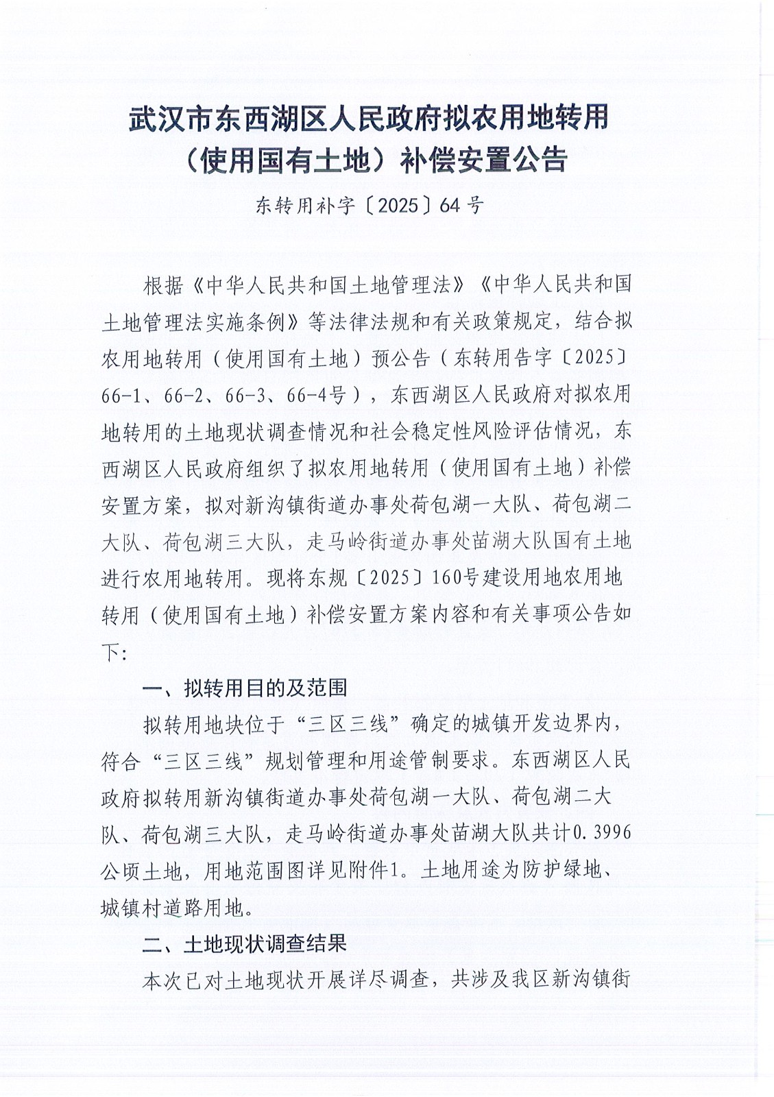 武汉市东西湖区人民政府拟农用地转用(使用国有土地)补偿安置公告(东转用补字〔2025〕64号)