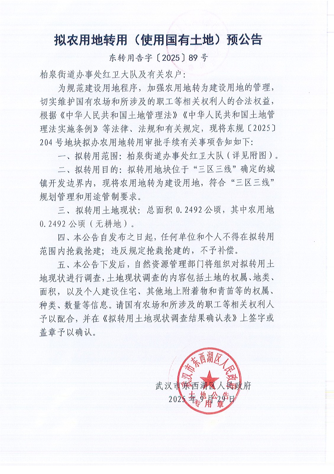 拟农用地转用(使用国有土地)预公告(东转用告字〔2025〕89号)