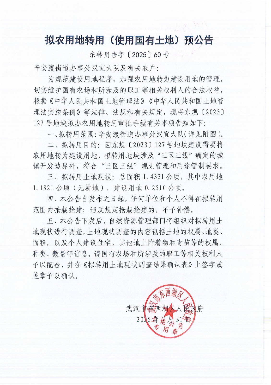拟农用地转用(使用国有土地)预公告(东转用告字〔2025〕60号)