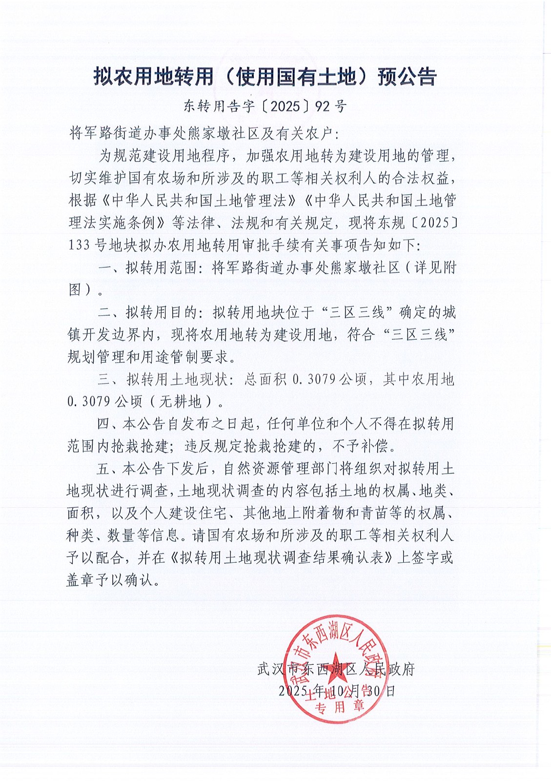 拟农用地转用(使用国有土地)预公告(东转用告字〔2025〕92号)