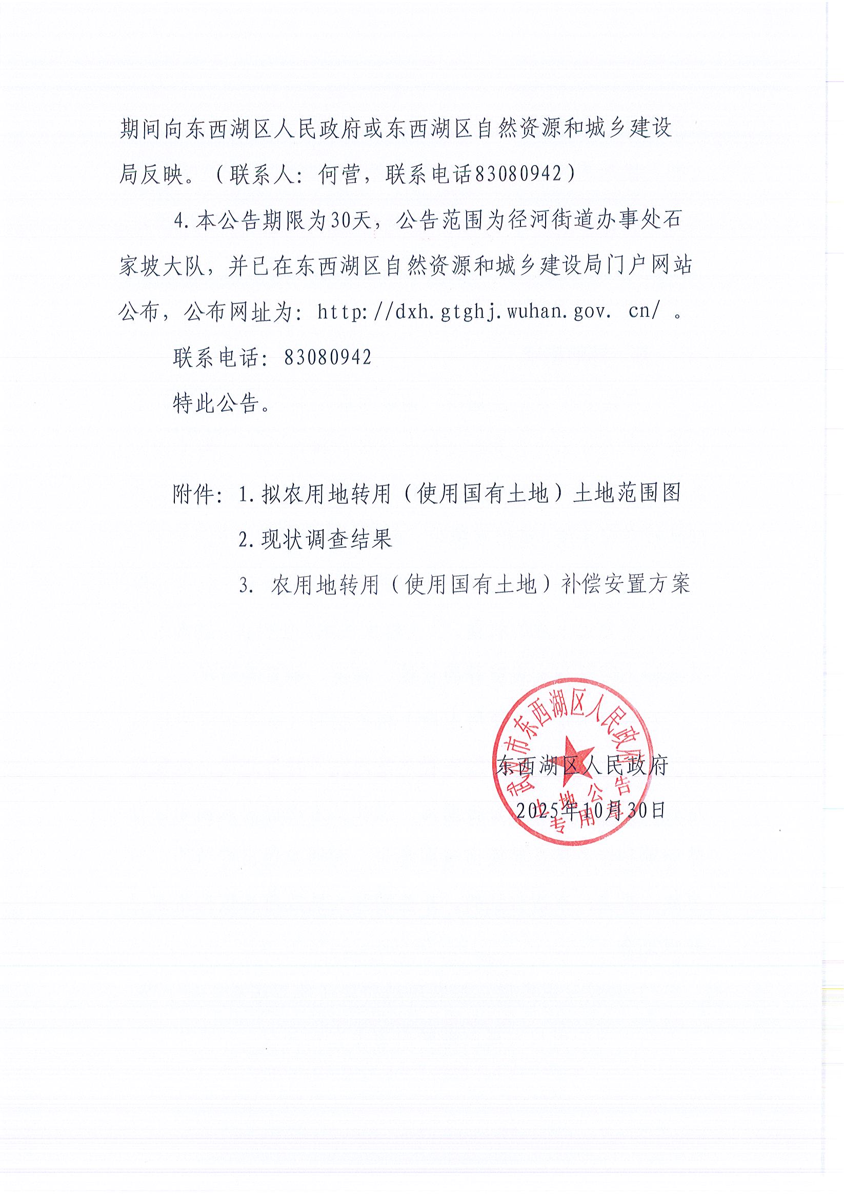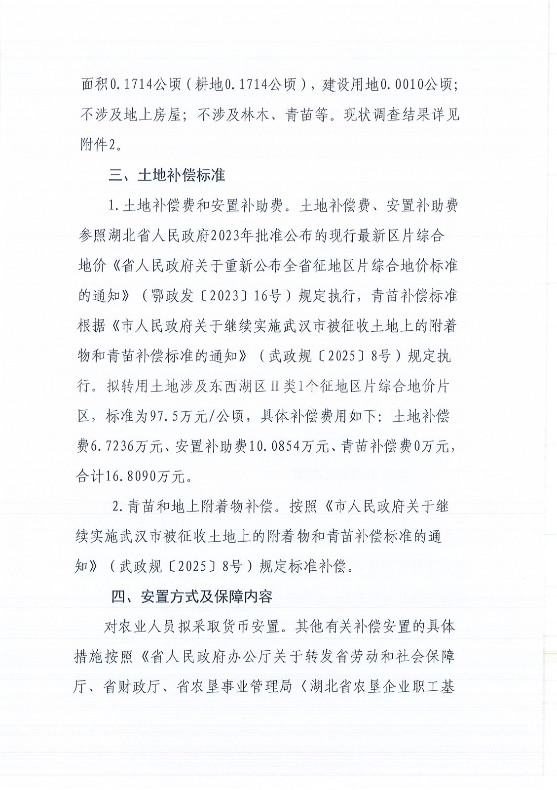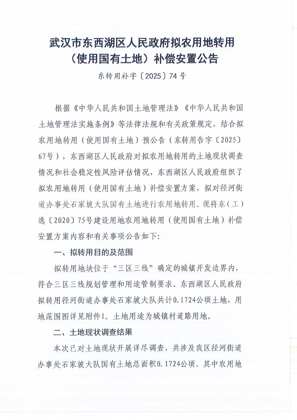 武汉市东西湖区人民政府拟农用地转用(使用国有土地)补偿安置公告(东转用补字〔2025〕74号)