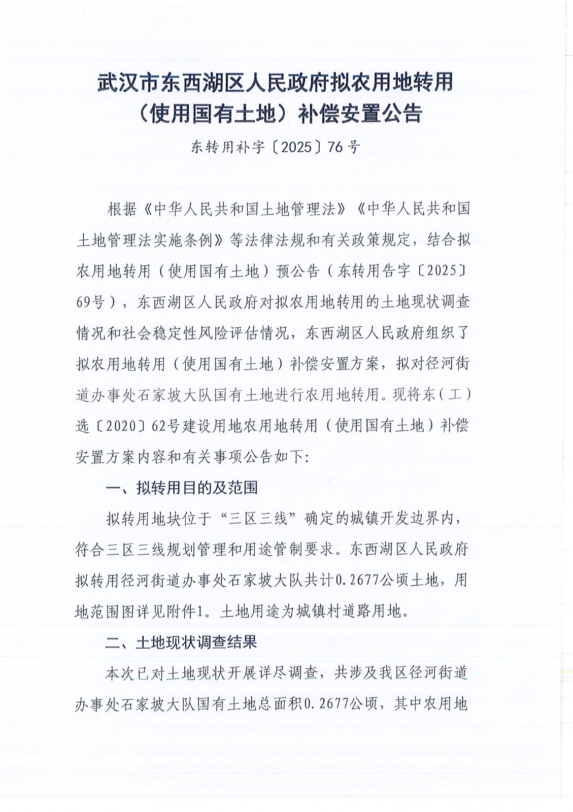 武汉市东西湖区人民政府拟农用地转用(使用国有土地)补偿安置公告(东转用补字〔2025〕76号)
