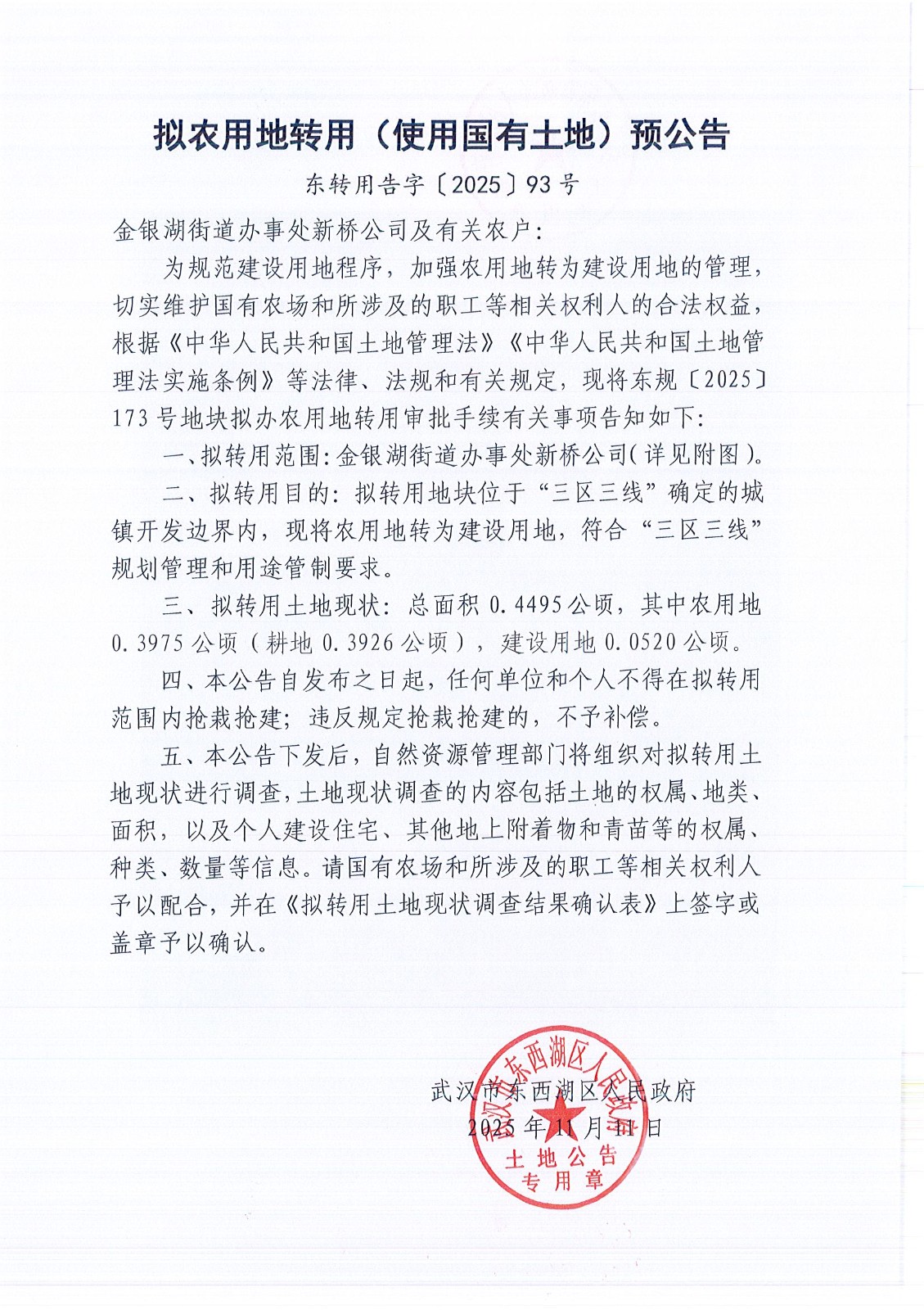 拟农用地转用(使用国有土地)预公告(东转用告字〔2025〕93号)