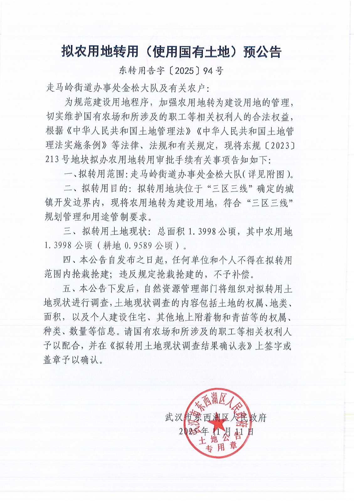 拟农用地转用(使用国有土地)预公告(东转用告字〔2025〕94号)