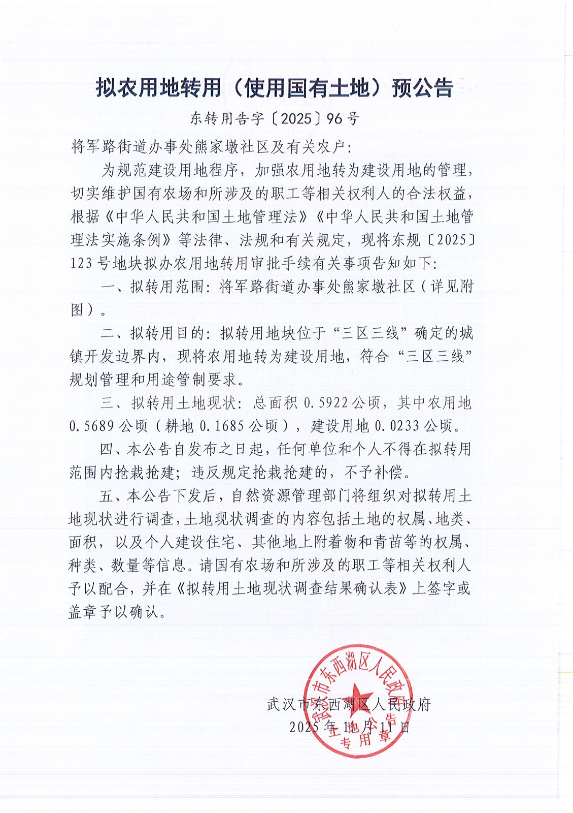 拟农用地转用(使用国有土地)预公告(东转用告字〔2025〕96号)