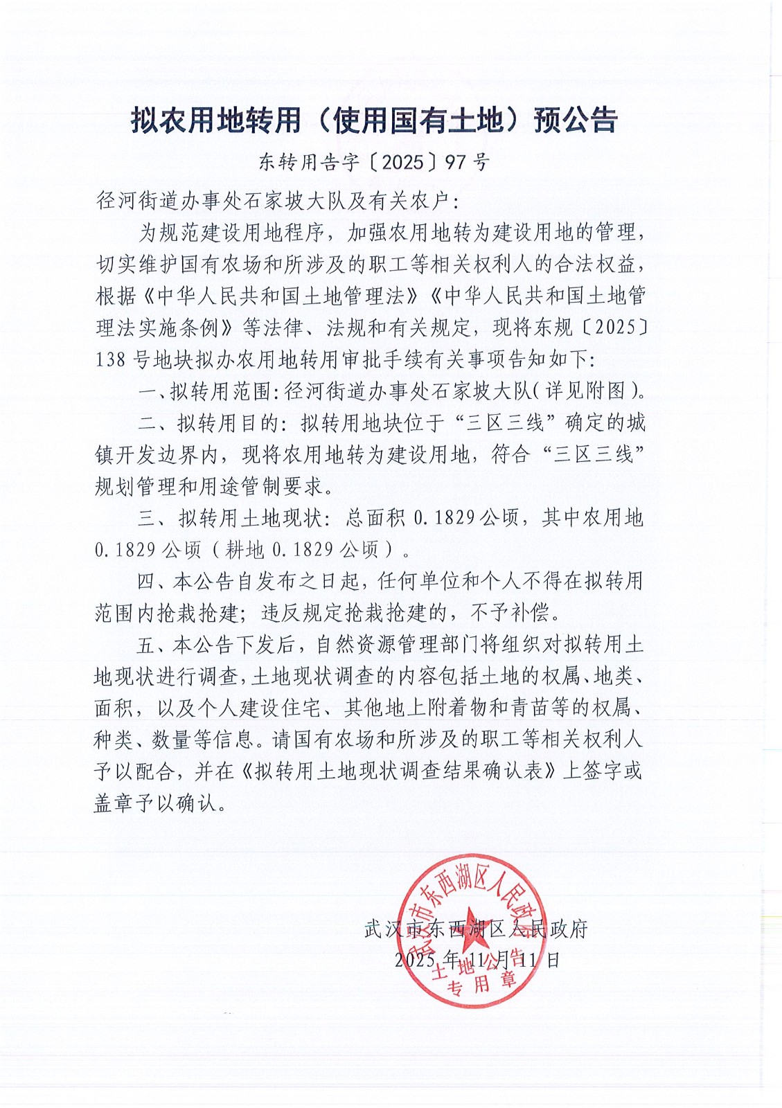 拟农用地转用(使用国有土地)预公告(东转用告字〔2025〕97号)