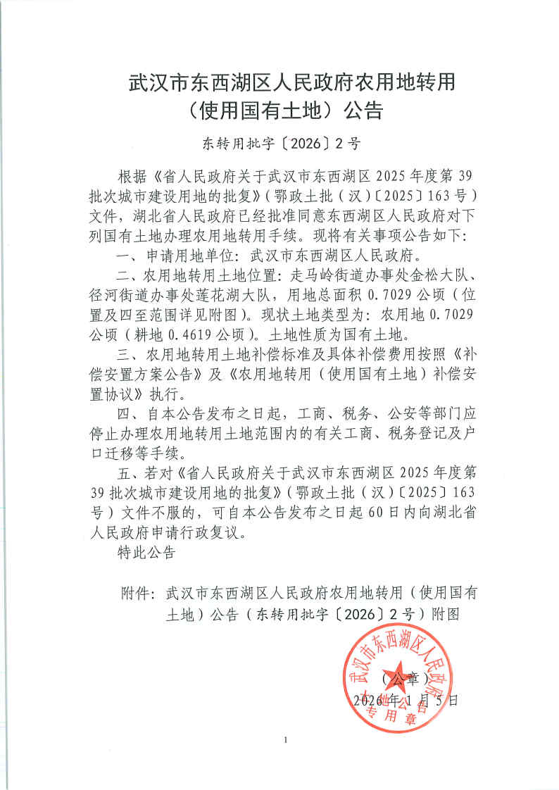 武汉市东西湖区人民政府农用地转用(使用国有土地)公告(东转用批字〔2026〕2号)