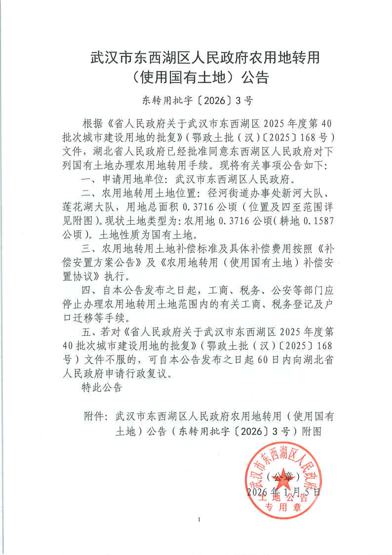 武汉市东西湖区人民政府农用地转用(使用国有土地)公告(东转用批字〔2026〕3号)