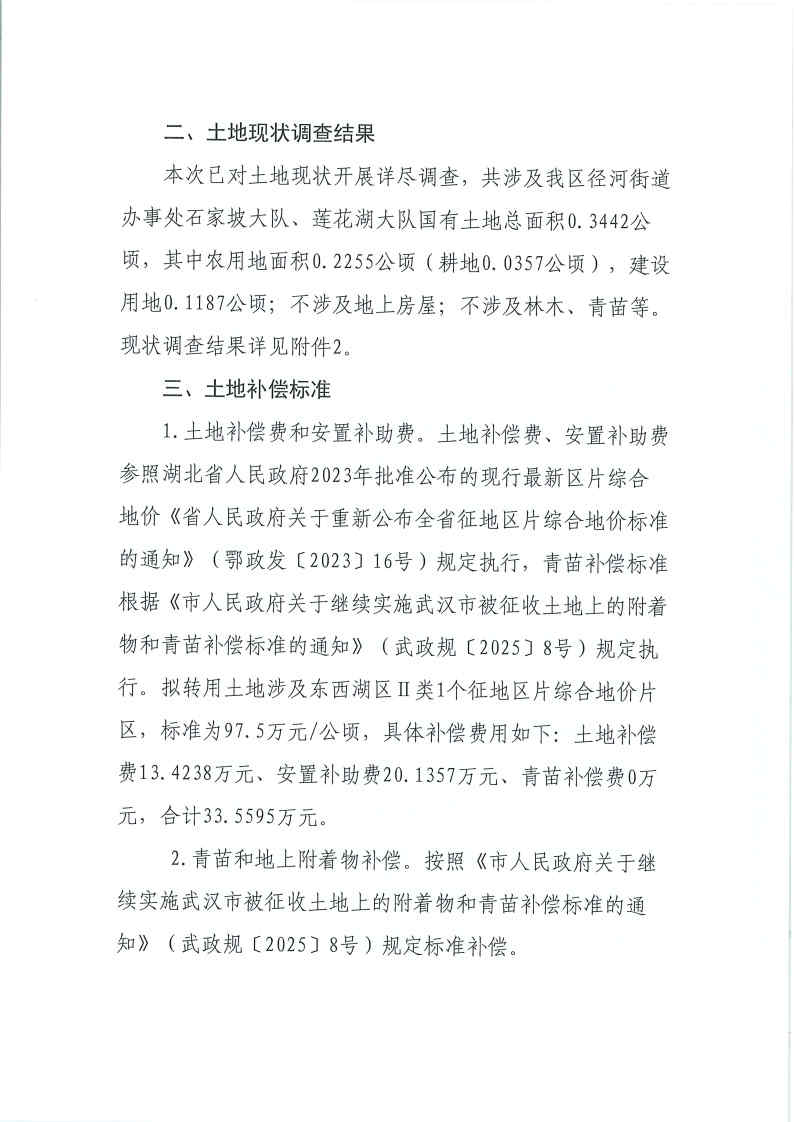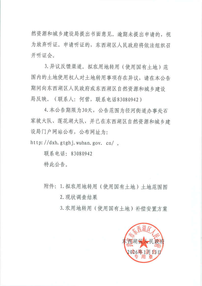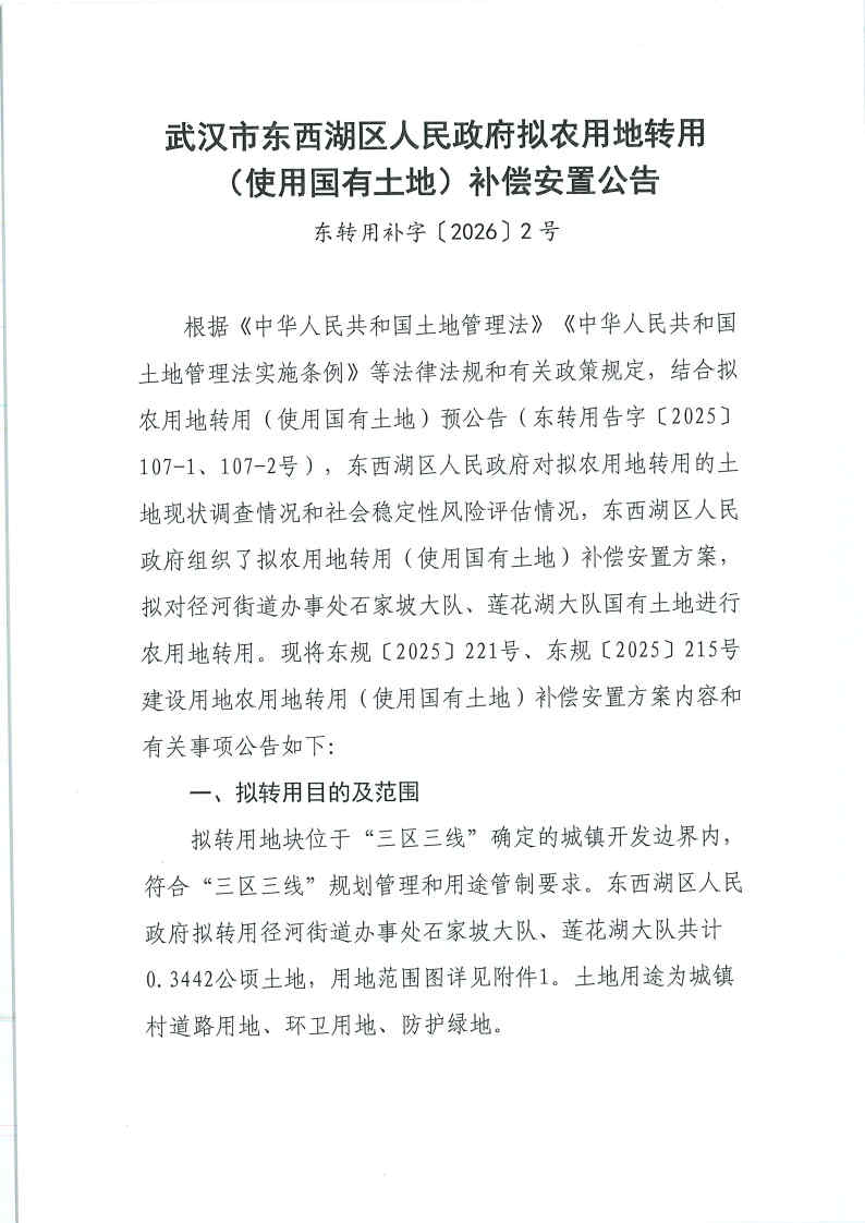 武汉市东西湖区人民政府拟农用地转用(使用国有土地)补偿安置公告(东转用补字〔2026〕2号)