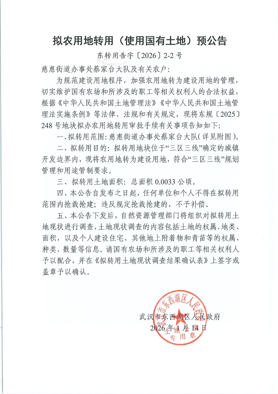 拟农用地转用(使用国有土地)预公告(东转用告字〔2026〕2-2号)