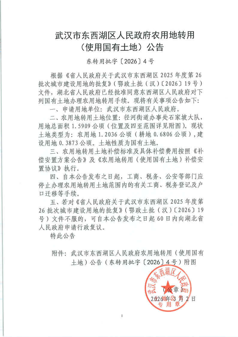 武汉市东西湖区人民政府农用地转用(使用国有土地)公告(东转用批字〔2026〕4号)