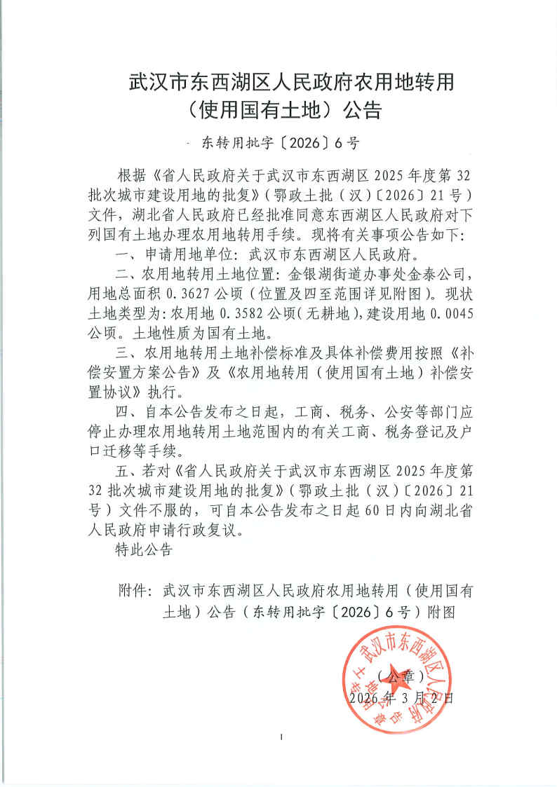 武汉市东西湖区人民政府农用地转用(使用国有土地)公告(东转用批字〔2026〕6号)