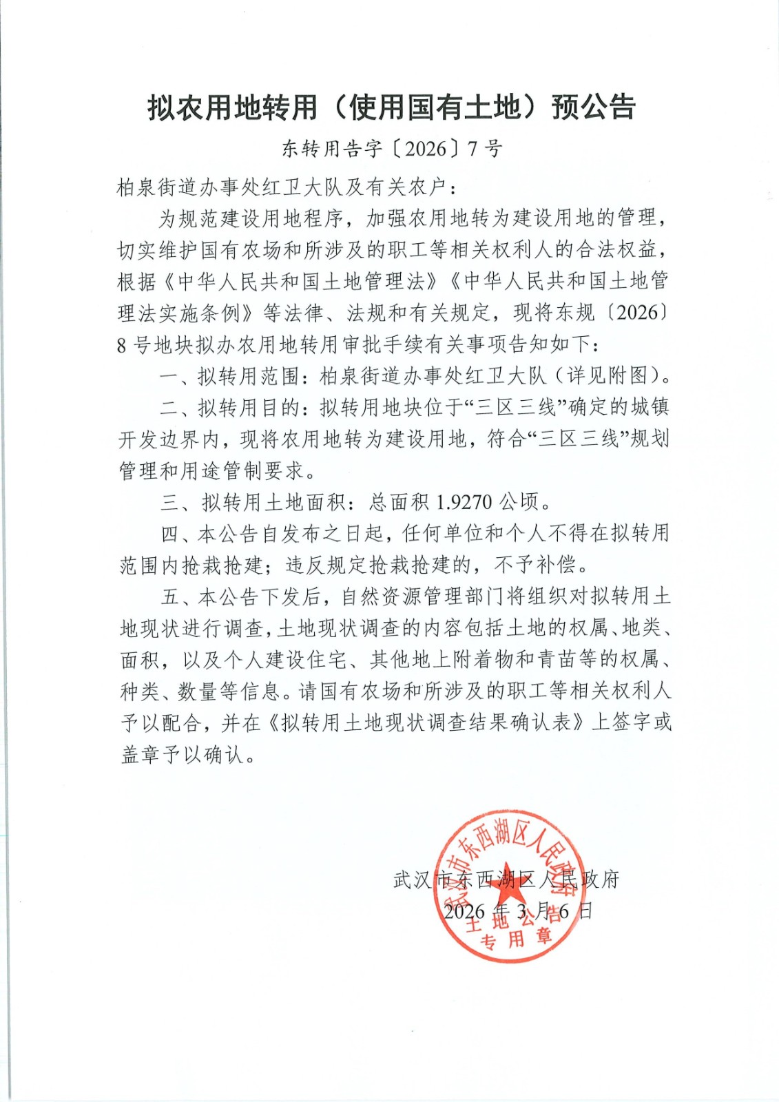 拟农用地转用(使用国有土地)预公告(东转用告字〔2026〕7号)
