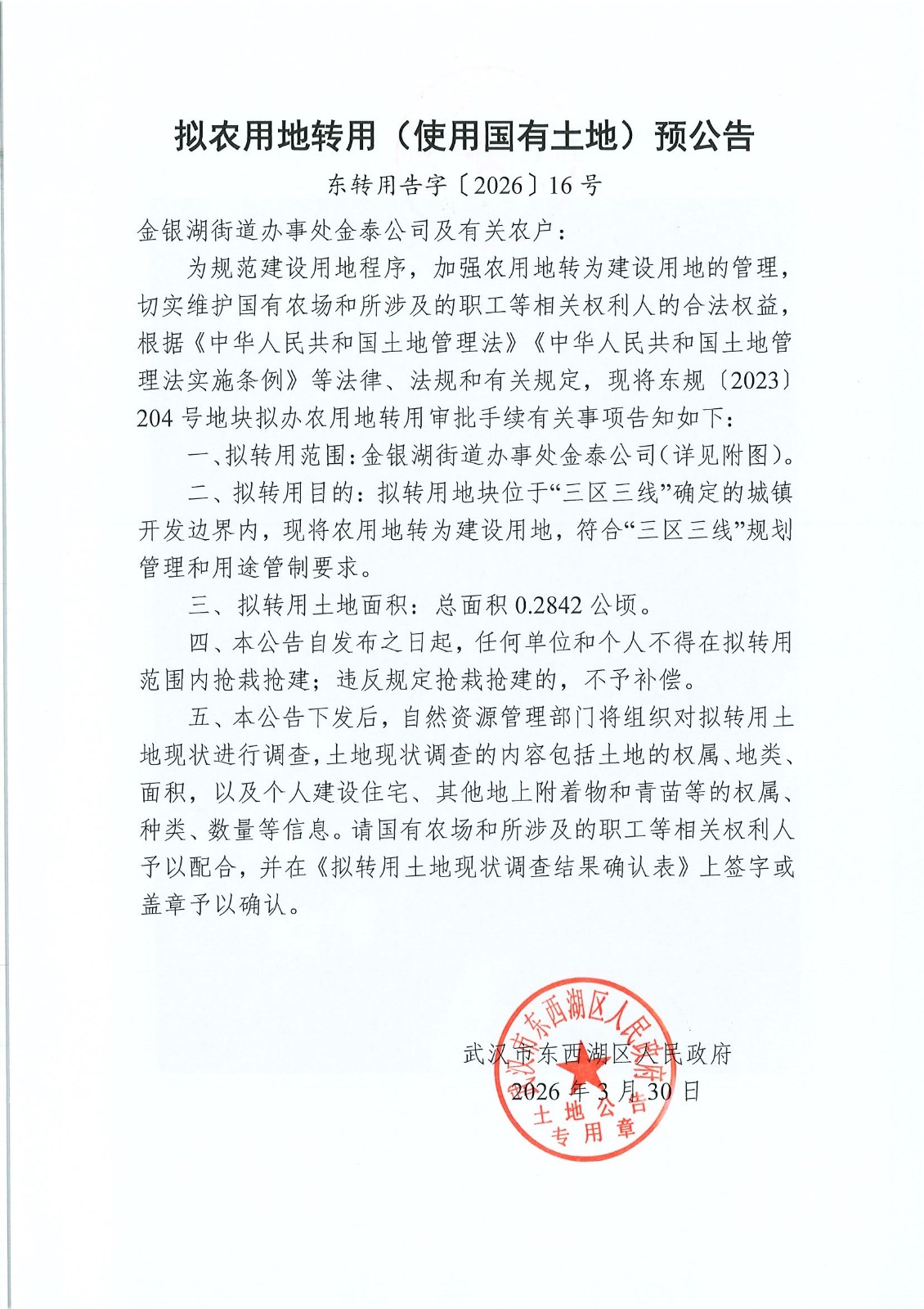 拟农用地转用(使用国有土地)预公告(东转用告字〔2026〕16号)